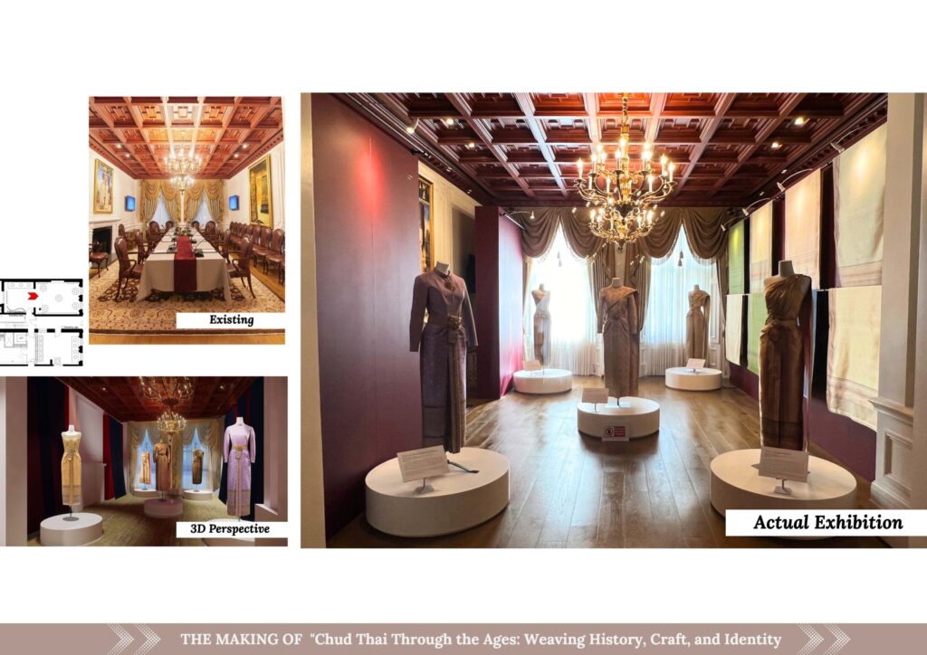 In addition to architectural work, I have also worked on exhibition design. This particular project was part of London Craft Week 2025 and featured traditional Thai outfits worn by Princess Sirivannavari. The challenge was to transform a meeting room at the Thai Embassy into a museum-like exhibition space.